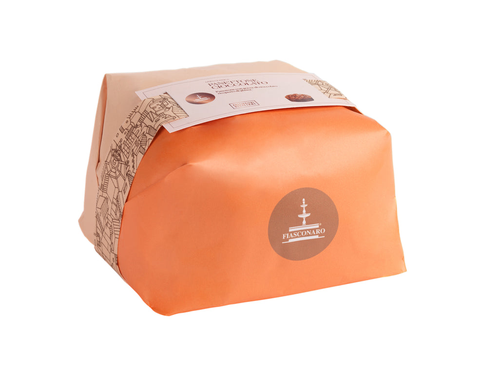 Panettone con gocce di cioccolato ricoperto di glassa, incartato a mano.